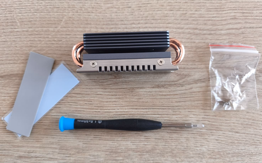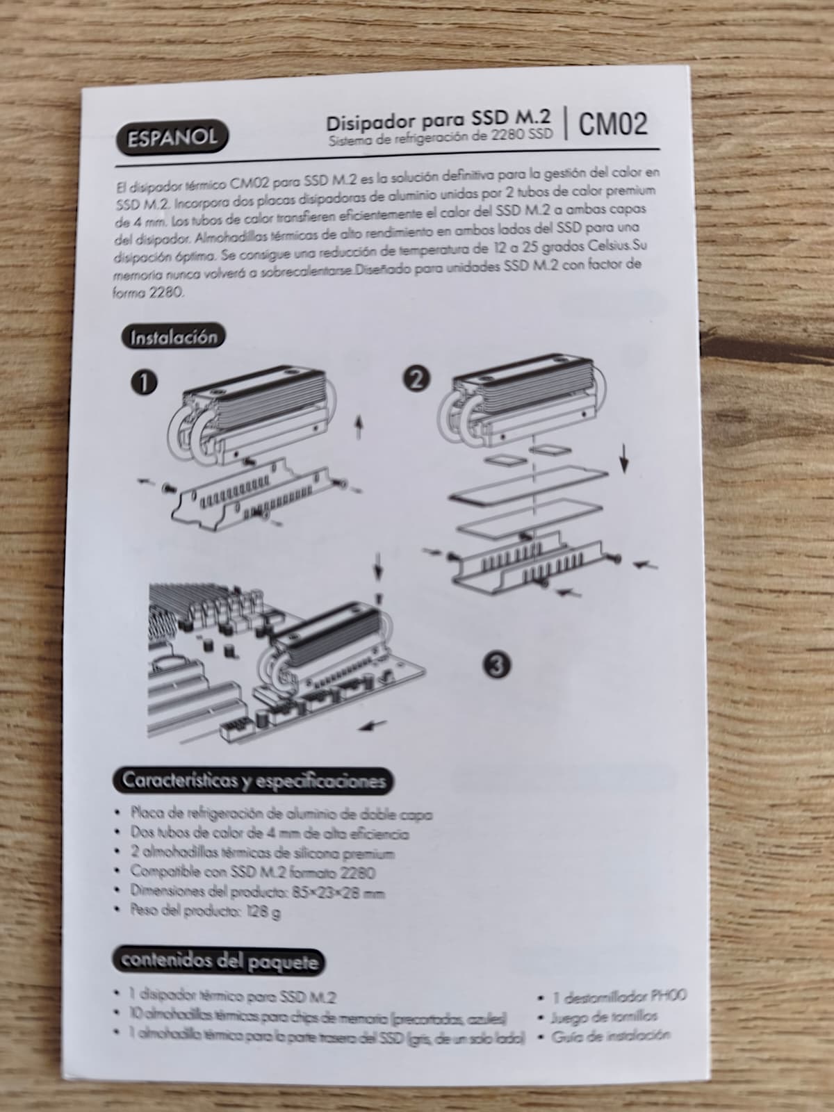 No hay misterio, simplemente sigue las indicaciones de las intrucciones que se adjunta en la caja. Desmonta la parte baja del disipador, coloca un thermal pad, pon el SSD, pon otro thermal pad y monta el cuerpo del disipador. Aprieta ambas partes y atornilla. Luego coloca el SSD NVM2 en el puerto M2, atornillalo o ánclaro (depende de tu placa madre) y a funcionar.
