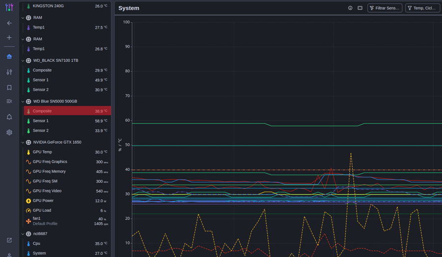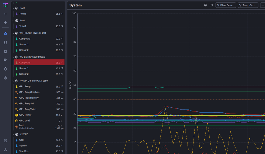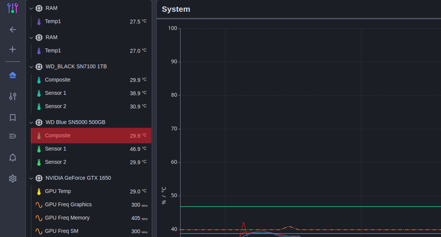 Así se ven los dos SSD NVMe de mi PC en reposo, con un uso normal de ofimática (Youtube, RRSS, oficina….)